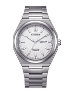 Introducing the Zenshin collection, where timeless design meets modern innovation. Built with Super Titanium™, a proprietary material that’s five times harder and 40% lighter than stainless steel, this 39mm silver-tone watch is both scratch- and rust-resistant, offering unmatched durability. Its sleek design is complemented by polished and brushed finishes, along with an integrated bracelet for effortless style. The textured white dial features a bold black minute ring, luminous hands, and markers for enhanced legibility, while a retro-inspired day-date display at 3 o’clock adds practicality. Powered by light with Eco-Drive technology, this watch never requires a battery and is water-resistant up to 100 meters—delivering both functionality and elegance.
