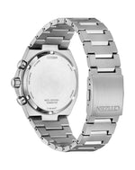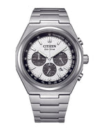 Introducing the Zenshin Chrono collection from Citizen—a perfect fusion of classic elegance and modern innovation. This 42.4mm silver-tone watch is crafted from Super Titanium™, offering exceptional durability, lightweight comfort, and a sophisticated finish. Its sleek chronograph pushers and integrated bracelet create a seamless, contemporary design. The textured white-silver dial features a bold black tachymetric scale and a triple-register chronograph layout, complemented by silver-tone and white accents on the hands and applied indices. Functional and stylish, it includes a split-second chronograph, 12/24-hour, running time, and a date display. Powered by Citizen’s Eco-Drive technology, it runs on any light source and never requires a battery. With water resistance up to 100 meters, this timepiece embodies precision and style for today’s modern explorer.