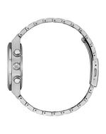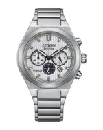 The new Zenshin Senkei chronograph brings a bold yet refined presence to the wrist. Crafted from silver-tone Super Titanium™, the 41mm case is ultra-lightweight, scratch- and rust-resistant, and seamlessly integrates into the matching bracelet for a clean, modern silhouette. Distinctive design elements—like a deeply knurled crown and angular, multi-sided bezel—add a unique character, while brushed finishing throughout enhances its sleek, sporty appeal. The textured white dial features applied hour markers and a balanced triple-register layout, displaying running seconds, a 1/5 second chronograph measuring up to 60 minutes, and 24-hour time. A subtle date window at 4:30 adds practical function. Powered by Citizen’s Eco-Drive technology—sustainably fueled by light, never needs a battery. Water resistant up to 100 metres.