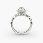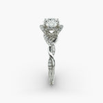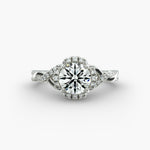 A gracefully twisted braid adorned with pavé diamonds intertwines into delicate loops, elegantly highlighting the center stone. This exquisite engagement ring is finished with ball prongs that perfectly enhance the design.
