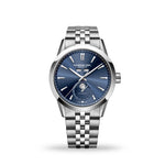 The Raymond Weil Freelancer 40mm Complete Calendar combines classic elegance with luxury. It features a stainless steel case with polished and brushed finishes, paired with a matching five-row bracelet. The blue sunray satin finish dial displays the day, date, month, and moon phase in perfect harmony, highlighted by silver-toned indexes coated with Super-Luminova®. Powered by the Calibre RW3281 self-winding movement, it offers a 62-hour power reserve.