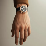 The Raymond Weil Millesime Tri-Compax Chronograph blends timeless design with modern elegance. The 39mm stainless steel case coated with rose gold PVD combines smooth and snailed contrasting finishes and is attached to a black calf leather strap. The black sector dial features white counters in a reverse panda design with hands and indexes lined with luminescent treatment. At the heart sits the RW5030 mechanical chronograph self-winding movement. Visible through the exhibition case back, this automatic movement has a power reserve of 62-hours, ensuring accuracy and reliability for all of your adventures.