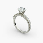 This flawless platinum engagement ring features French pavé-set diamonds that radiate brilliance, drawing every eye to the center diamond of your choice.